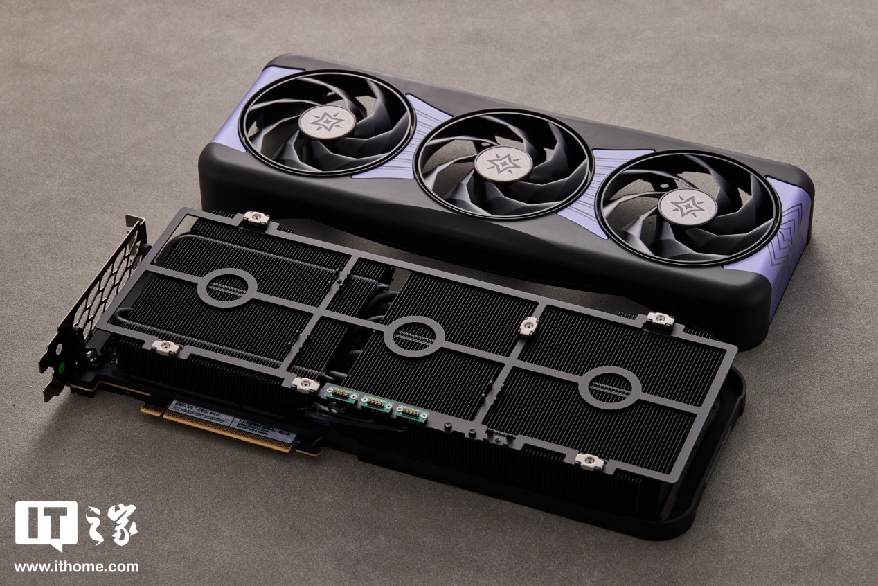 可拆卸的显卡装甲部分搭载了磁星 MAX 散热器,配备 3 把 9518 霜环风扇,扇叶做了折角优化结构设计,风阻更小、风压更大、风力更强。