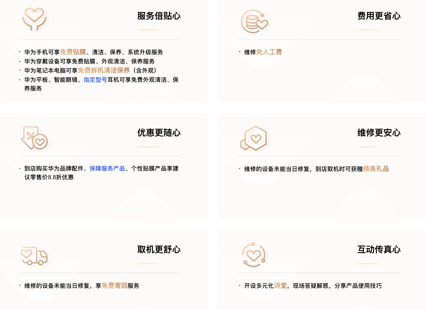 华为同时表示,活动期间用户到店购买华为品牌配件、保障服务产品、个性贴膜产品享建议零售价 8.8 折优惠,如维修的设备未能当日修复,到店取机时可获赠精美礼品,如维修的设备未能当日修复,享免费寄回服务。