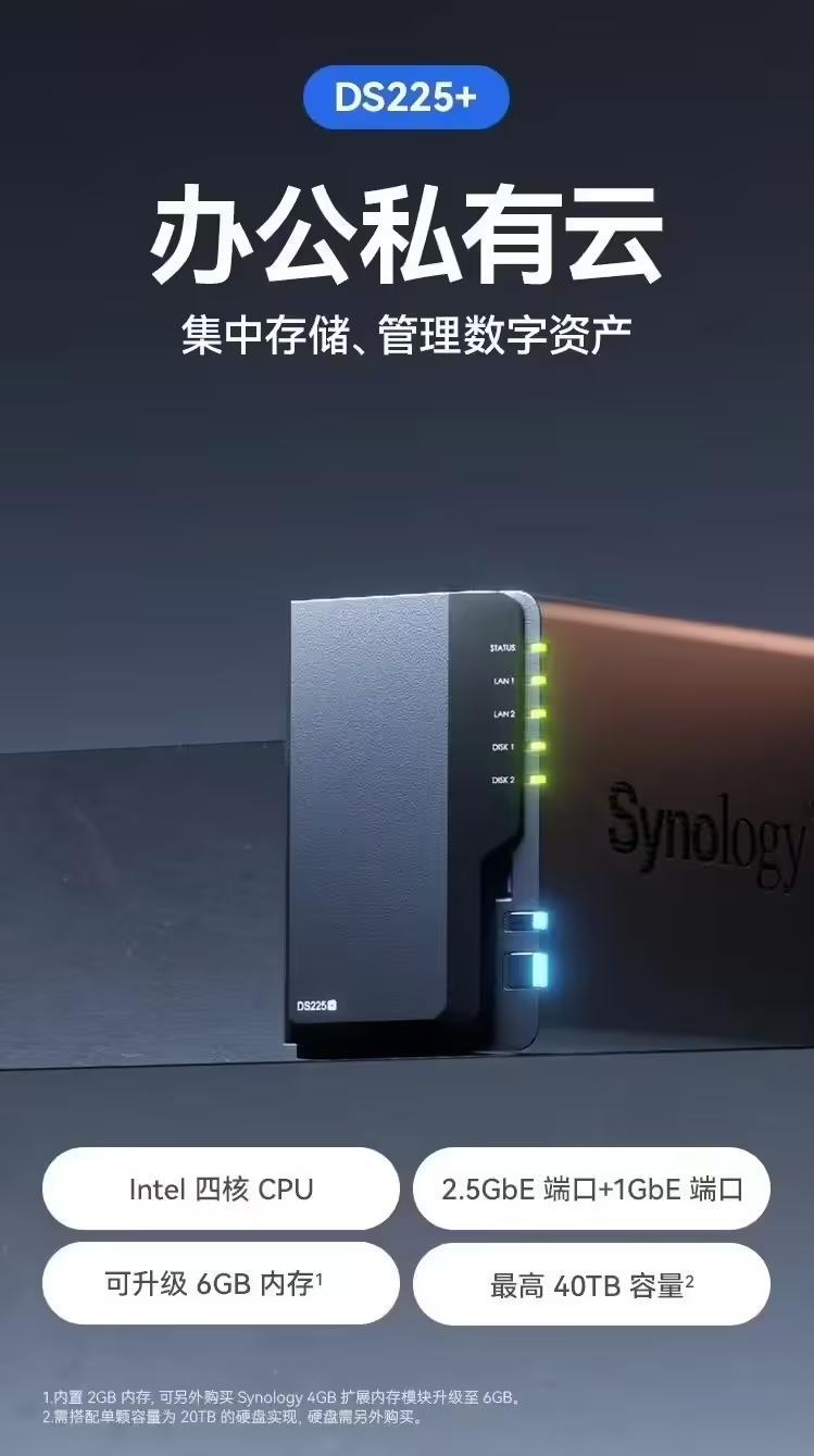 群晖DS225+发布:升级2.5G网口,搭载英特尔四核CPU