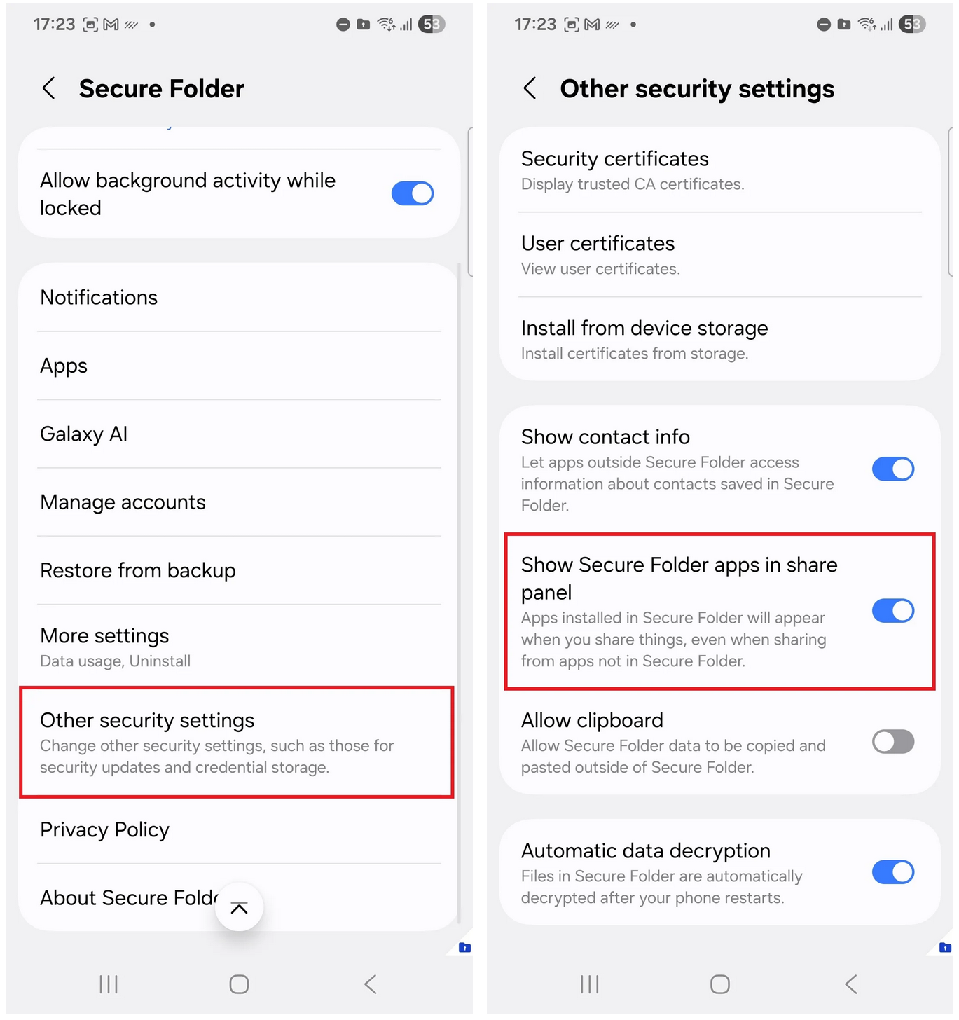 该选项默认关闭,不过此前有用户反馈,希望从正常安装的应用中,分享文档、媒体或文本到安全文件夹中的应用,这一新选项使得这种操作成为可能。