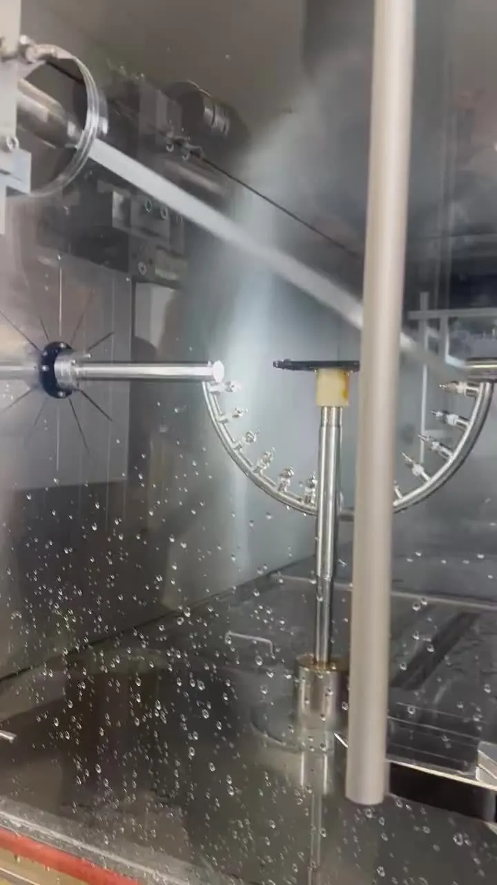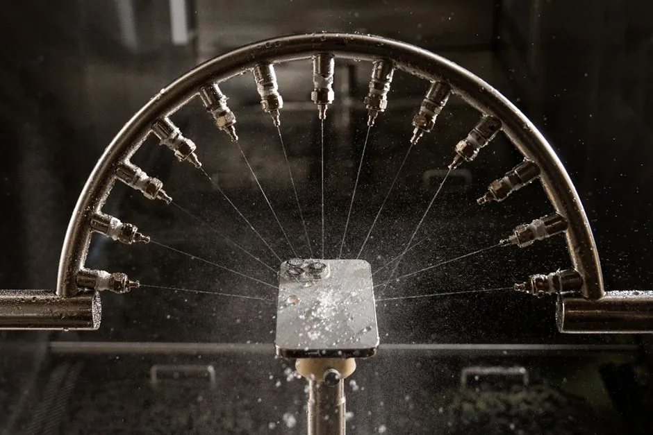 苹果实验室的 IPX 测试舱模拟雨水和水条件,以评估各种产品的防水性能是否达到特定的防护等级。