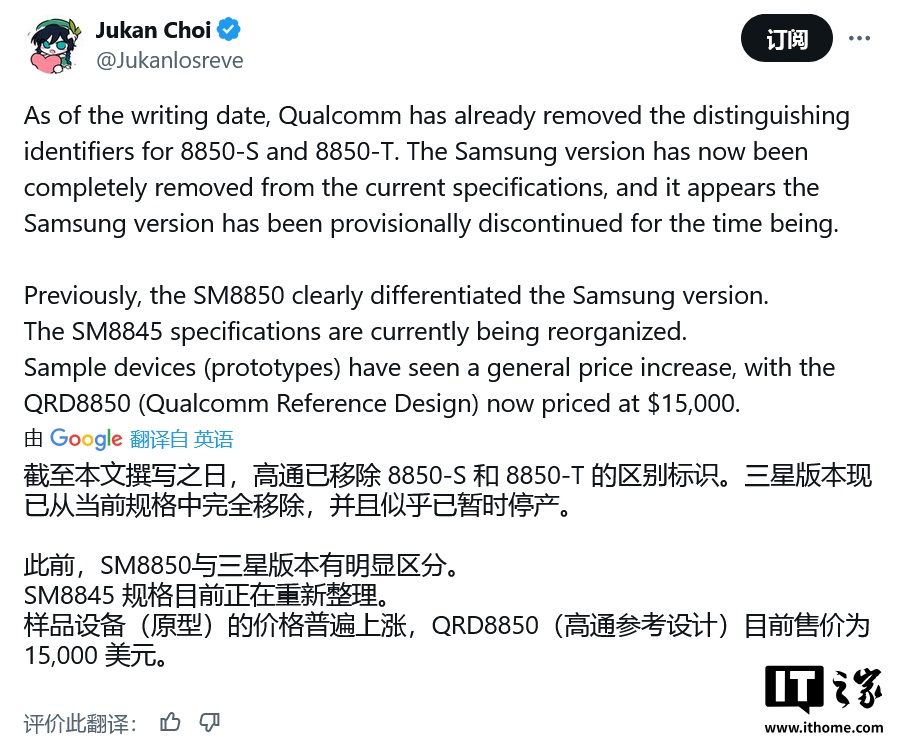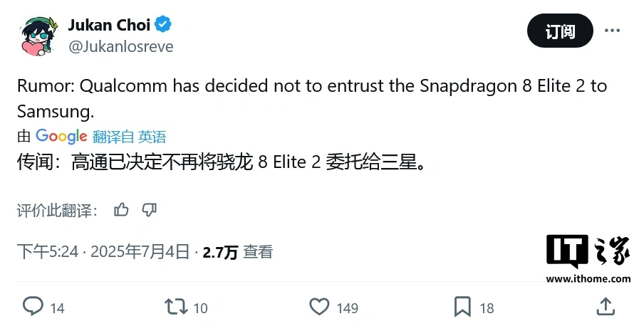 IT之家 7 月 5 日消息,消息源 @Jukanlosreve 昨日(7 月 4 日)在 X 平台发布推文,曝料称高通已取消了三星的 2nm 工艺代工计划,不再委托其生产第二代骁龙 8 至尊版芯片。