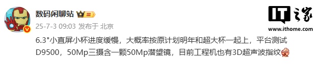 博主 @数码闲聊站 此前曾曝光某厂 6.3 英寸直屏新机的部分信息,预计为 OPPO Find X9s。爆料称该机进度缓慢,大概率按原计划明年和超大杯一起上,平台测试 D9500(天玑 9500 处理器),配备 50Mp 三摄,含一颗 50Mp 潜望镜,目前工程机也有 3D 超声波指纹。