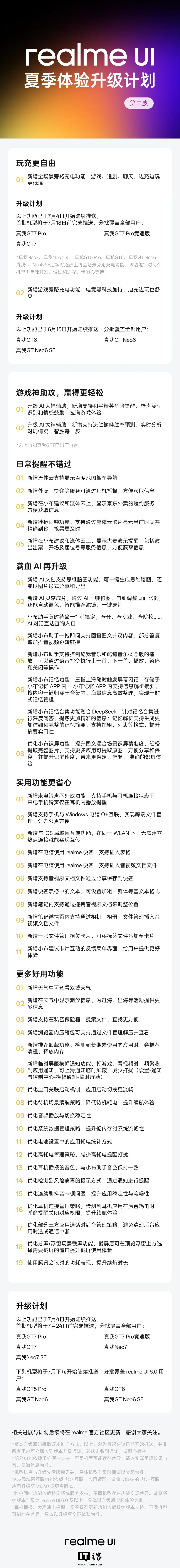 IT之家 7 月 6 日消息,真我手机官方账号 @realmeUI 昨日在真我社区发布了“realme UI 夏季体验升级计划第二波”,新版本确认新增全场景旁路充电、升级 AI 大神辅助等功能。