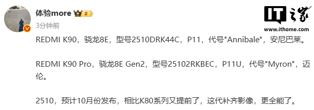 IT之家 7 月 6 日消息,博主 @体验 more 今日曝光 REDMI K90 系列部分信息,预计今年 10 月份发布,补齐影像配置。
