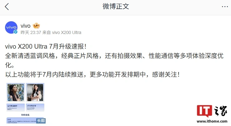 IT之家 7 月 7 日消息,vivo 官方昨日晚发布了 vivo X200 Ultra 手机 7 月份升级速报,该机本月新版本将更新全新相机风格、4D 游戏振感等,同时还有拍摄效果、性能通信等多项体验深度优化(版本 7 月内陆续推送)。
