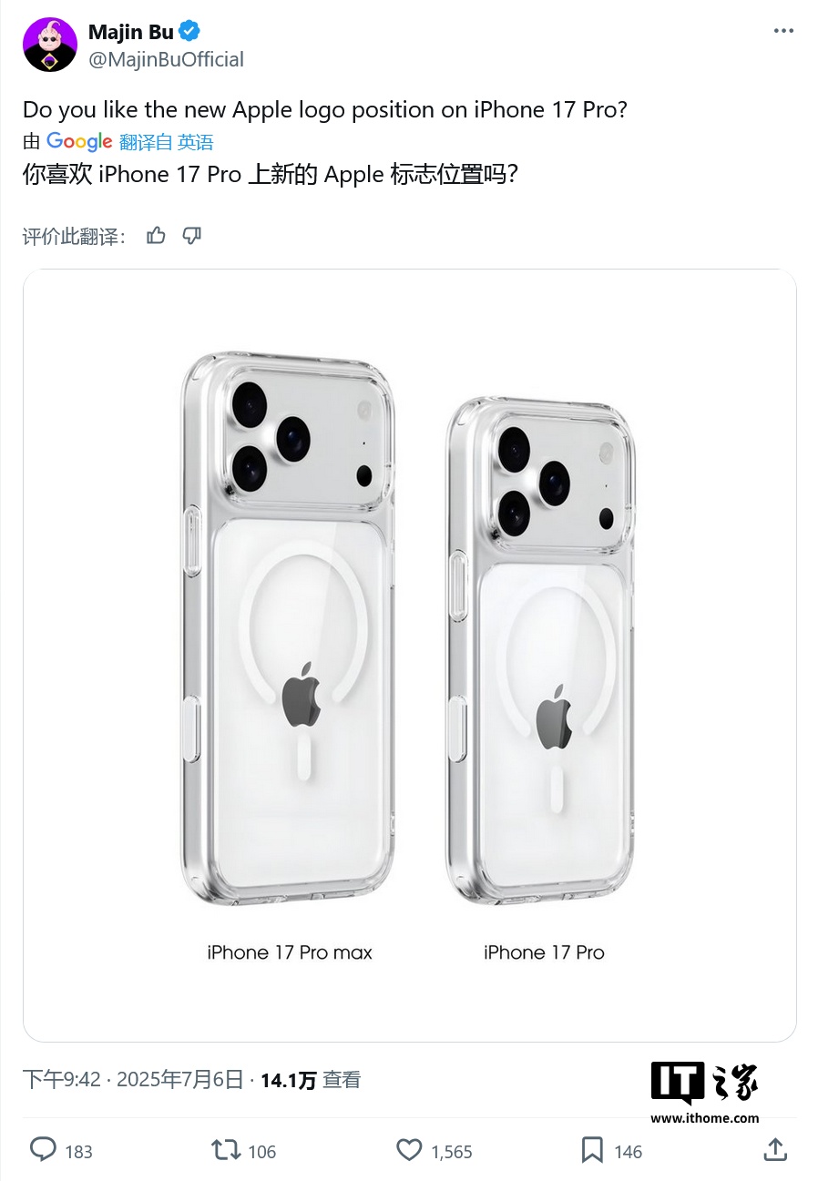 IT之家 7 月 8 日消息,消息源 @MajinBuOfficial 于 7 月 6 日在 X 平台发布推文,分享了一张渲染图,展示了苹果 iPhone 17 Pro 和 iPhone 17 Pro Max 两款旗舰佩戴手机壳后的效果。