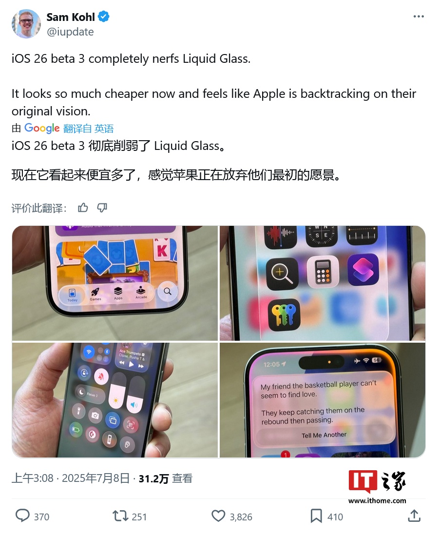 这种调整虽然提高了可读性,但部分用户认为相比较在 WWDC 2025 全球开发者大会上演示的效果,Beta 3 所呈现的“液态玻璃”是一种倒退。