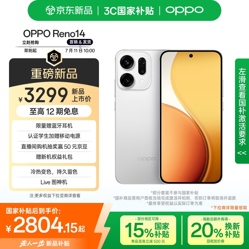 京东 OPPO Reno14 16GB+512GB 日月光 高清长焦实况 全新小直屏 Live 图 AI 拍照 5G 智能手机 学生游戏 国家补贴 3299 元直达链接