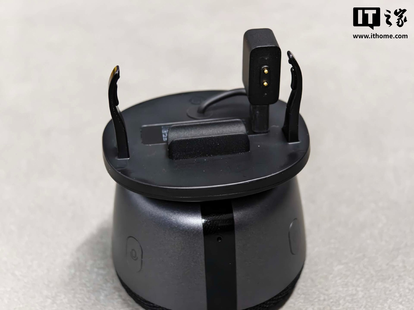 再看机身底部,隐藏着一个小音箱,机身上仅配备了两枚按键,一枚用于开机,另一枚则是语音键。在蓝牙连接模式方面,小米手环多功能桌搭支持 3 种方式,分别为手机蓝牙配对、手环 BLE 配对和米家 BLE 配对。