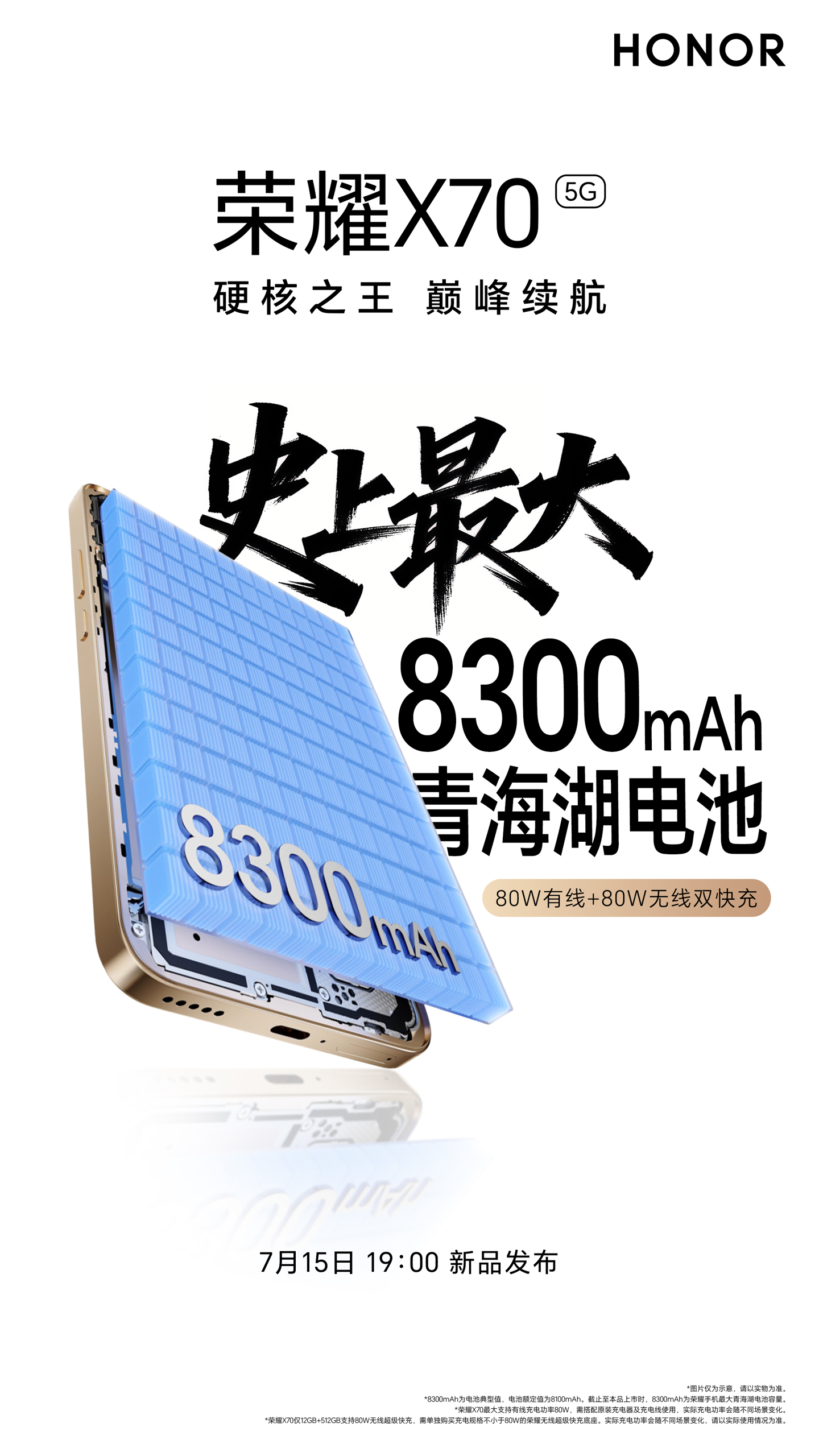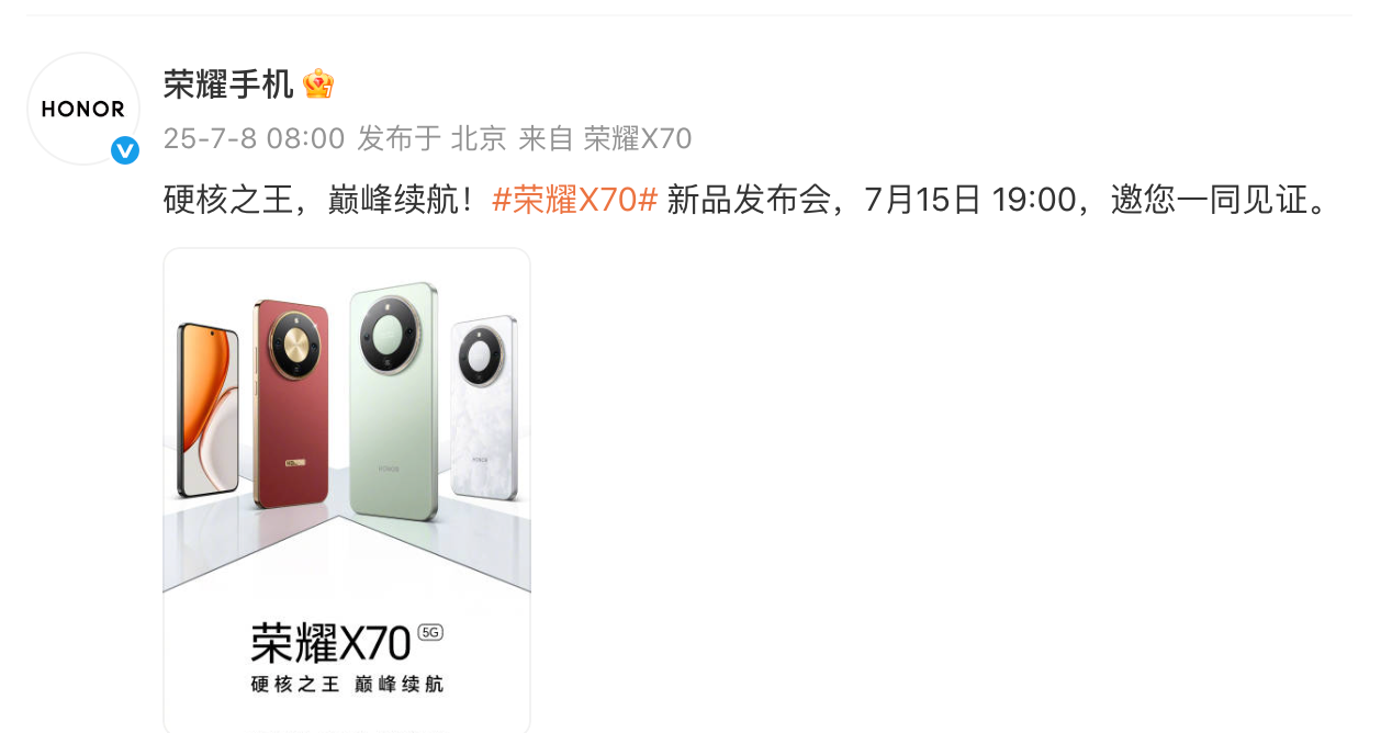 7 月 8 日,荣耀正式官宣了 X 系列的最新科技新作 —— 荣耀 X70,并宣布这款手机将于 7 月 15 日正式发布。