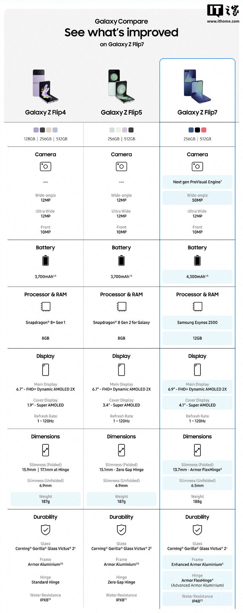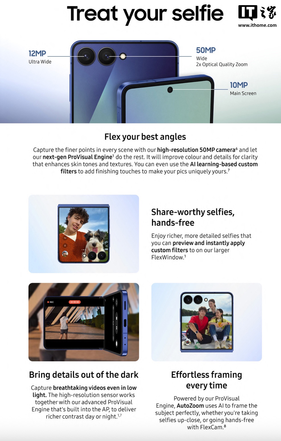 该机可选蓝 / 黑 / 粉三种配色,展开厚度 6.5mm,折叠厚度 13.7mm,重量 188 克。外屏采用一块 4.1 英寸 Super AMOLED 面板,抛弃了“文件夹”式设计,内屏采用了一块 6.9 英寸 FHD+ 120Hz AMOLED 2X 面板,提供 10MP 自拍摄像头;机身后置 50MP 主摄和 12MP 超广角镜头。