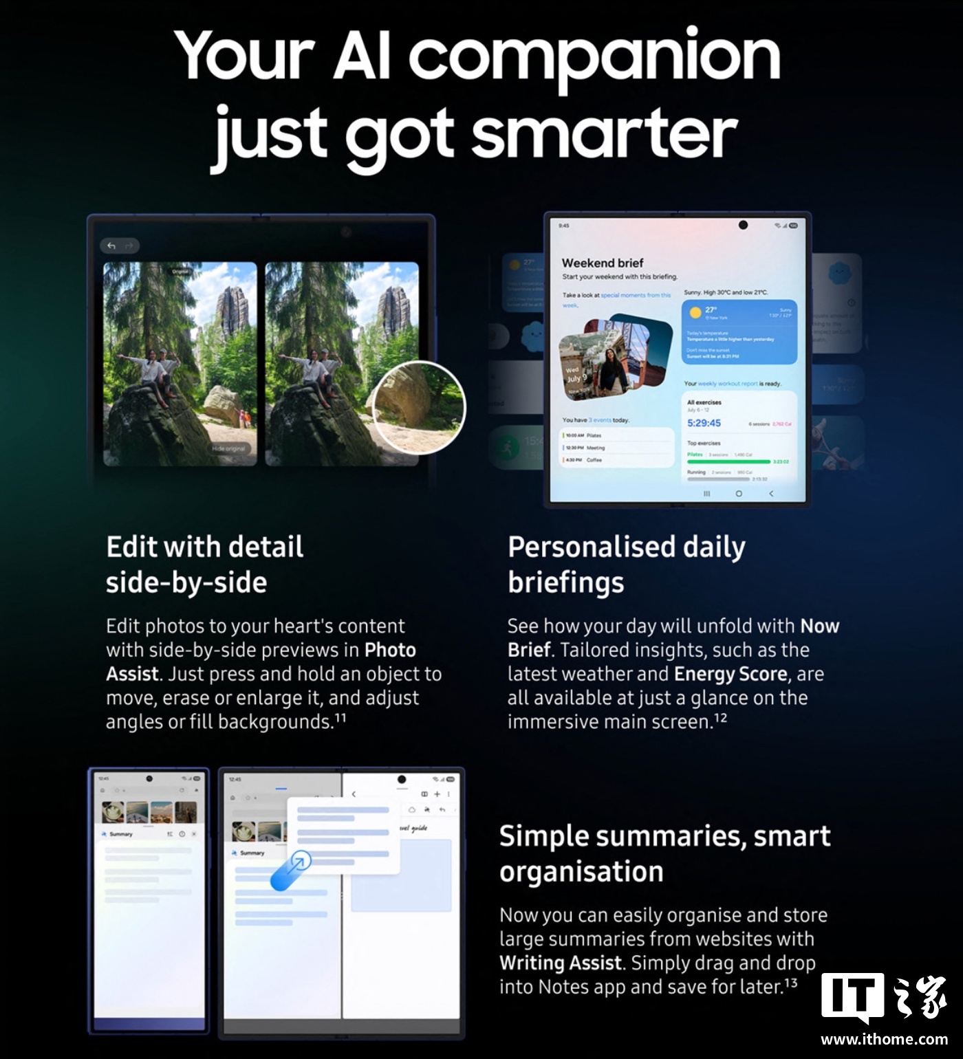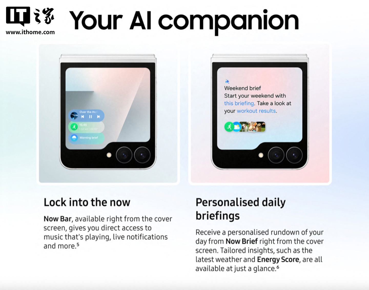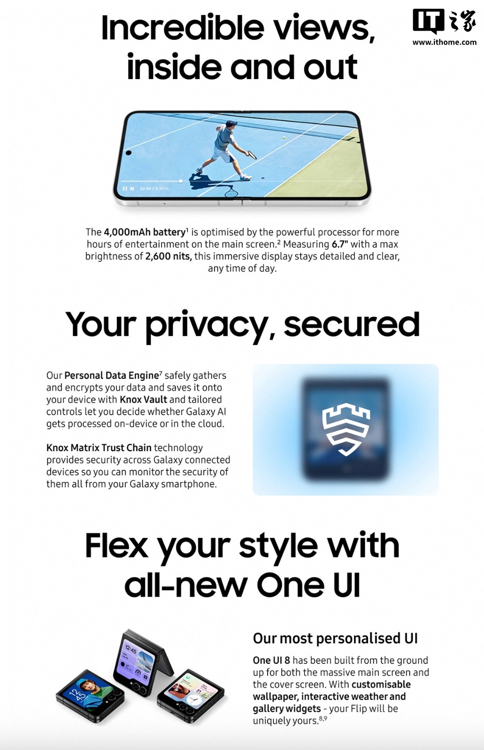 该机可选黑白双色,展开厚度 6.9mm,折叠厚度 14.9mm,重量 187 克。外屏仍采用“文件夹”式 3.4 英寸 Super AMOLED 面板,内屏采用了一块 6.7 英寸 FHD+AMOLED 2X 面板,提供 10MP 自拍摄像头;机身后置 50MP 主摄和 12MP 超广角。