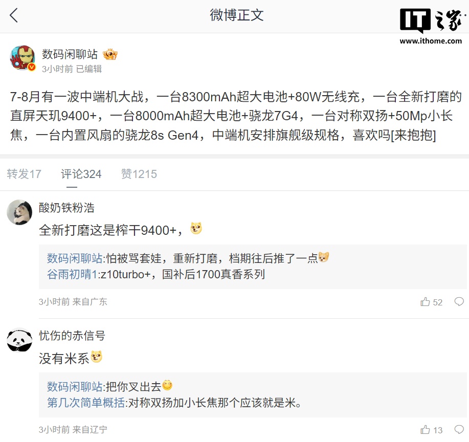 博主 @数码闲聊站 今日爆料称,7~8 月有一波中端机大战,并称“中端机安排旗舰级规格”: