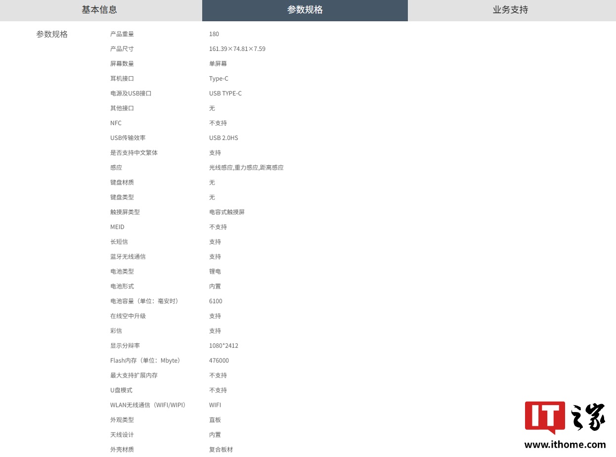 该机尺寸为 161.39×74.81×7.59mm、重约 180g,配备 Type-C 接口(USB 2.0HS 传输速率),其屏幕分辨率为 1080*2412,内置 6100mAh 电池。