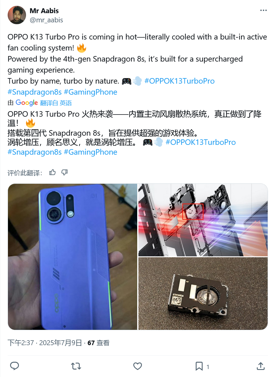 IT之家查询相关资料,称 OPPO K13 Turbo Pro 机型还会配备主动风扇散热系统,通过优化散热,改进游戏体验。
