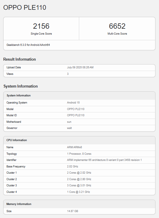 IT之家 7 月 10 日消息,科技媒体 Gsmarena 昨日(7 月 9 日)发布博文,报道称 OPPO K13 Turbo 手机现身 GeekBench 跑分库,6.3.0 版本单核成绩为 2156 分,多核成绩为 6652 分。