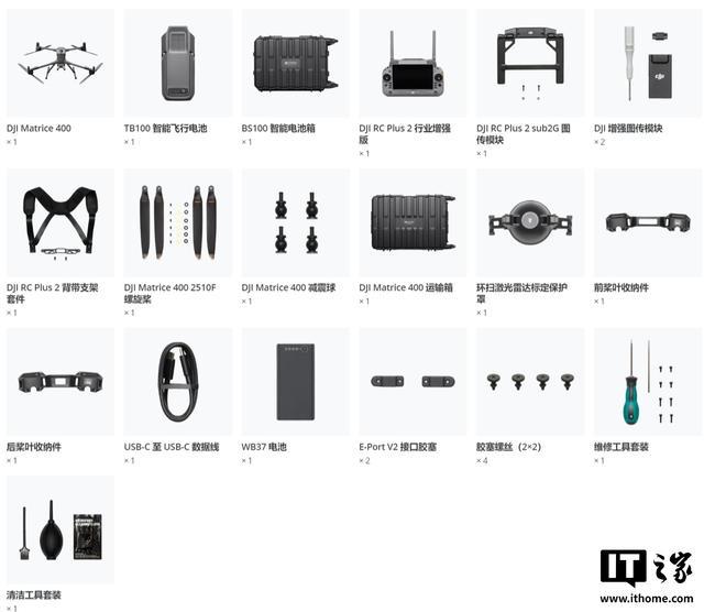 需要注意的是,DJI Matrice 400 配件与 Matrice 350 配件均不通用。IT之家附 DJI Matrice 400 无忧旗舰版套装包含物品如下: