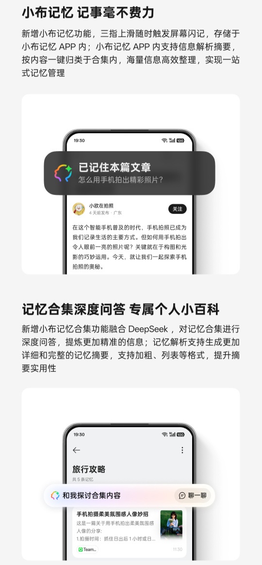 此外,小布记忆 App 内支持信息解析摘要,按内容一键归类于合集内,实现一站式记忆管理。同时,小布记忆合集功能融合 DeepSeek,支持对记忆合集进行深度问答,提炼更加精准的信息;记忆解析支持生成更加详细和完整的记忆摘要,支持加粗、列表等格式。