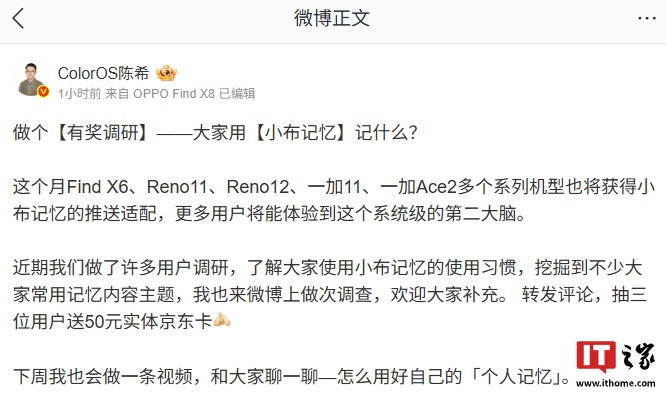 IT之家 7 月 11 日消息,OPPO ColorOS 设计总监陈希今日发文透露,这个月 Find X6、Reno11、Reno12、一加 11、一加 Ace2 等系列机型将获得小布记忆的推送适配。