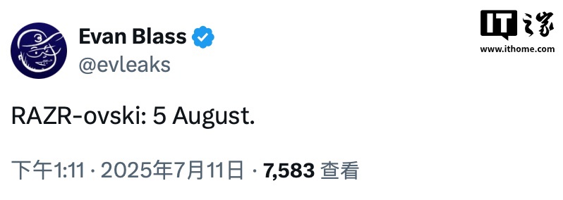 同时,消息人士 Evan Blass 今日于 X 平台发文,称该款机型将于 8 月 5 日发布,但并未透露更多该机的细节。