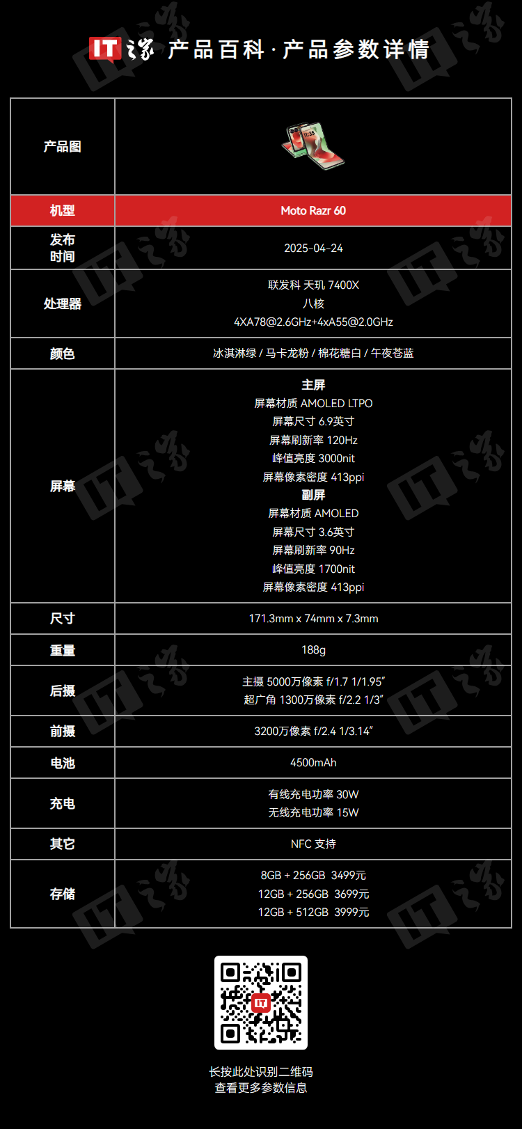 IT之家注:联想 moto razr 60 小折叠手机推出于 5 月 8 日,搭载联发科天玑 7400X 处理器,外屏和内屏尺寸分别为 3.6 英寸、6.9 英寸,内存可选 8GB、12GB、16GB,存储空间从 128GB 起步,最高可达 512GB,国行 8+256GB 版本售价 3499 元。