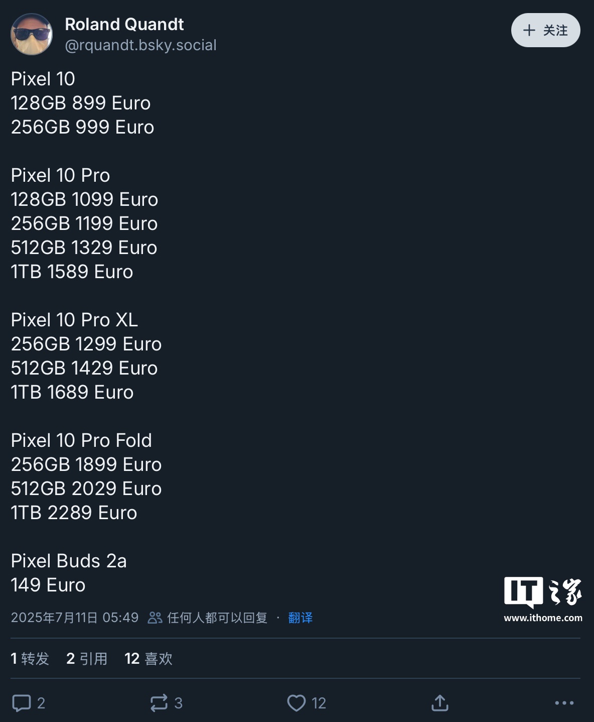 IT之家 7 月 12 日消息,消息源 Roland Quandt 在 Bluesky 平台曝光了谷歌即将推出的 Pixel 10 系列手机及 Pixel Buds 2a 耳机的定价信息,IT之家整理如下: