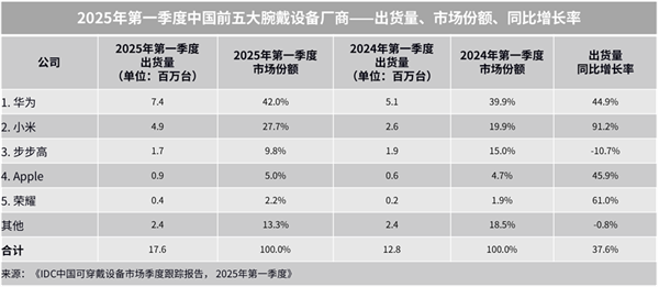 根据IDC数据显示,2025年第一季度华为在全球腕戴市场上跃升到第一位,出货量同比增长率42.4%,在全球腕戴市场稳居出货量第一。