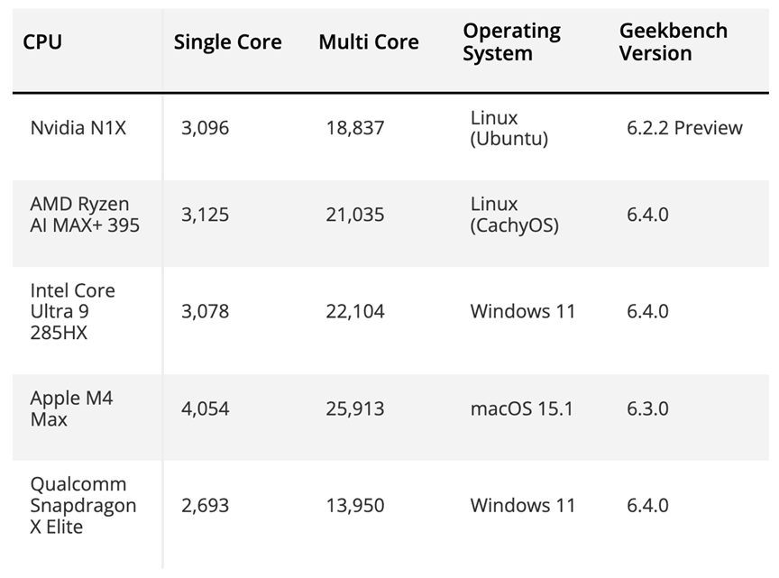 在深入探讨性能之前,通常不建议比较不同操作系统和 Geekbench 版本的 CPU。因此,我列出了一些相关的 CPU 样本,并注明了它们的操作系统和 Geekbench 版本。据称,N1X 在单核和多核测试中分别获得了 3096 分和 18837 分,平均频率为 4 GHz。即使在不同的环境下,它的性能也远超英特尔 Arrow Lake-HX 和 AMD Ryzen AI MAX(Strix Halo)等顶级芯片。