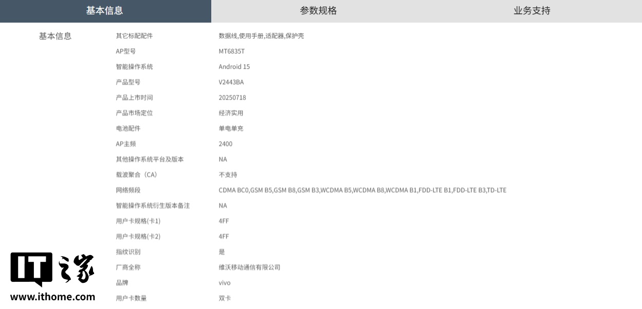相关页面显示,vivo Y50m 5G 手机采用矩阵相机模组设计,屏幕尺寸为 6.74 英寸(电容式触摸屏),前置 500 万像素镜头、后置 1300 万像素镜头,预装 Android 15 系统。