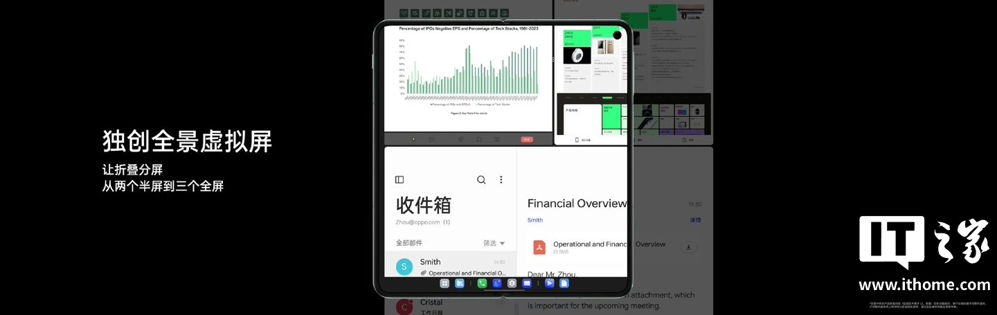朱海舟表示,全景虚拟屏功能相比传统横滑切换 App,其优势是双应用都在前台满血运行。相比锤科一步的优势是应用可读性和屏幕利用率更高。在折叠上支持三分屏。据 OPPO 官方介绍,“超视野全景虚拟屏”可突破屏幕物理边界,让大屏分屏从“两个半屏”到“三个全屏”,实现让屏幕有边,内容无界。