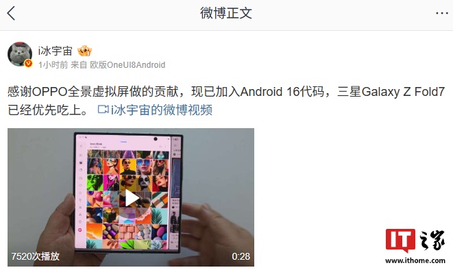 IT之家 7 月 13 日消息,据博主 @i冰宇宙 分享,OPPO 全景虚拟屏现已加入 Android 16 代码,三星 Galaxy Z Fold7 已经优先支持该功能