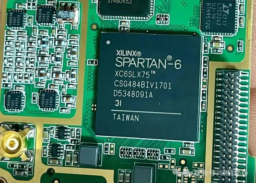 这是一块包含Xilinx Spartan-6系列XC6SLX75型号FPGA芯片的电路板,该芯片采用BGA封装,产自台湾,具备高度的灵活性和可编程性,适用于多种电子应用,如信号处理和通信。电路板上还集成了其他电子元件,共同实现特定的功能,可能用于对讲机等设备的信号处理和调制解调。