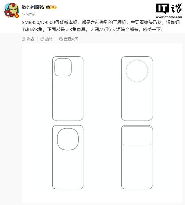 IT之家 7 月 14 日消息,博主 @数码闲聊站 今日分享了 SM8850 / D9500 母系新旗舰工程机草图,主要为镜头形状,没加细节和改 R 角,正面都是大 R 角直屏,据称“大圆 / 方形 / 大矩阵全都有”。