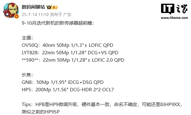 此外,该博主还分享了 9-10 月迭代新机的新传感器超前瞻:
