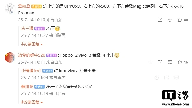 评论区有网友分析称,从左上到右下依次为 OPPO Find X9、vivo X300、荣耀 Magic 8、小米 16。