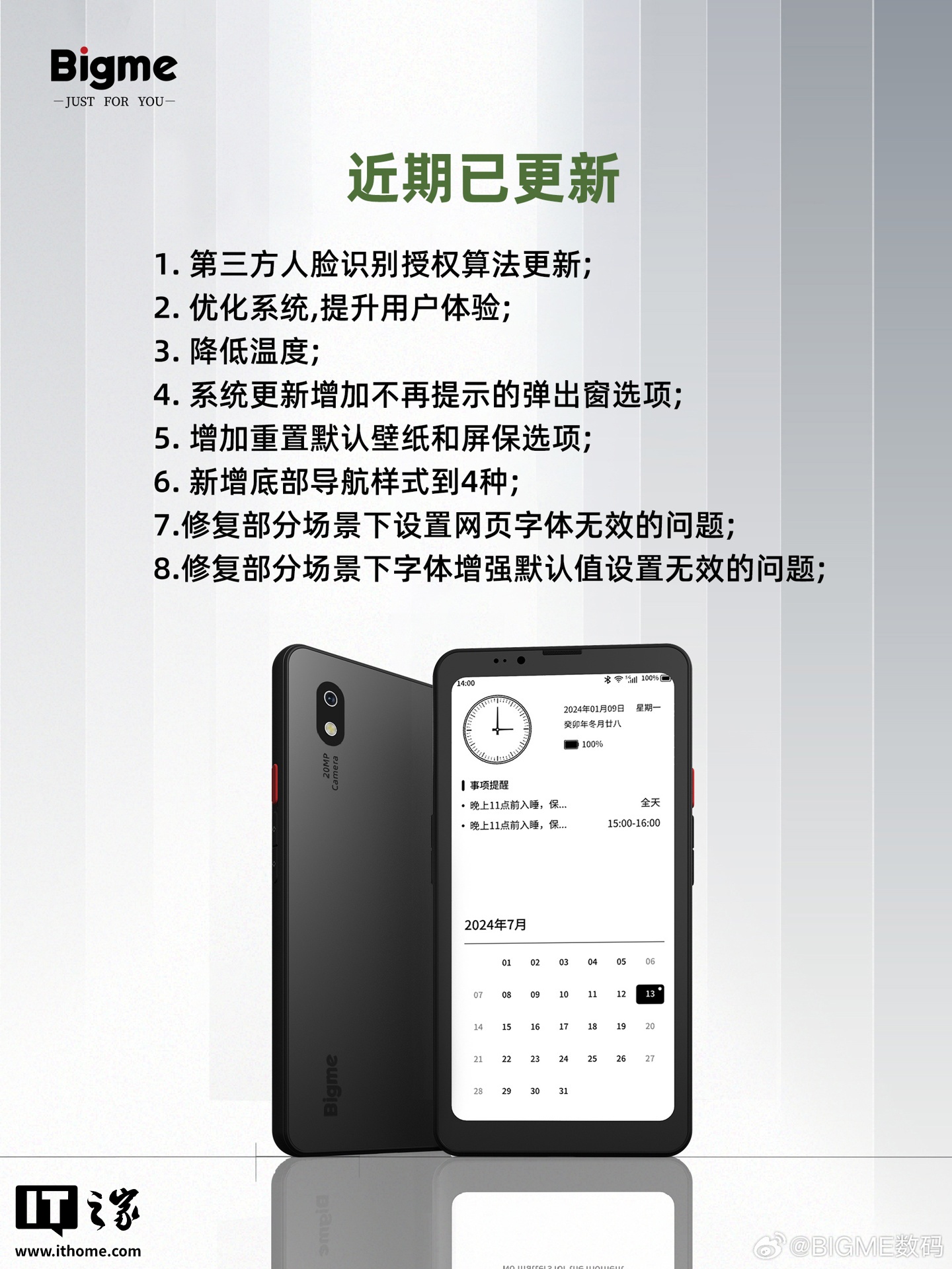 IT之家 7 月 14 日消息,大我 Bigme 智能办公本官方微博今日发文宣布,Bigme HiBreak Pro 墨水屏手机开启 2.4.8 最新版本固件更新。
