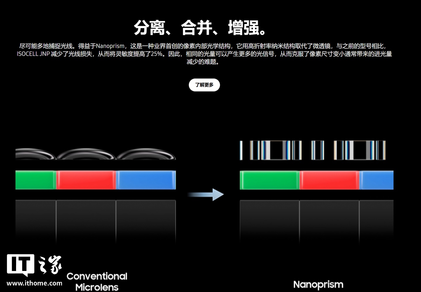 据三星介绍,该 CMOS 内置业界首创的像素内部光学结构纳米棱镜(Nanoprism),用高折射率纳米结构取代了微透镜,与之前的型号相比,ISOCELL JNP 将灵敏度提高了 25%,减少了光线损失,克服了像素尺寸变小带来的进光量减少的问题。