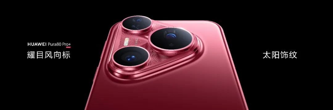 Pura 80 Pro+、Pura 80 Ultra采用全新耀目风向标设计,以高级珠宝和腕表中经典的太阳纹为灵感,呈现光芒绽放的太阳饰纹,展现光影层次与秩序感;同时镜头以环带勾勒出风向标形状,形成视觉焦点。