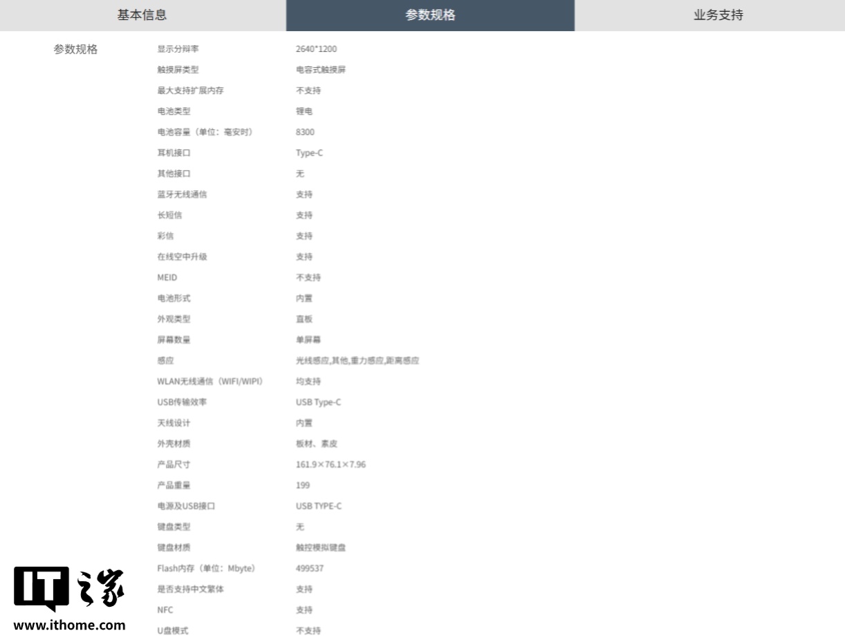 该机搭载第四代骁龙 6 移动平台,尺寸为 161.9×76.1×7.96/7.76mm、重约 199g,配备 USB Type-C 接口,支持 NFC,外壳材质包括板材、素皮,其屏幕分辨率为 2640*1200,内置 8300mAh 电池。