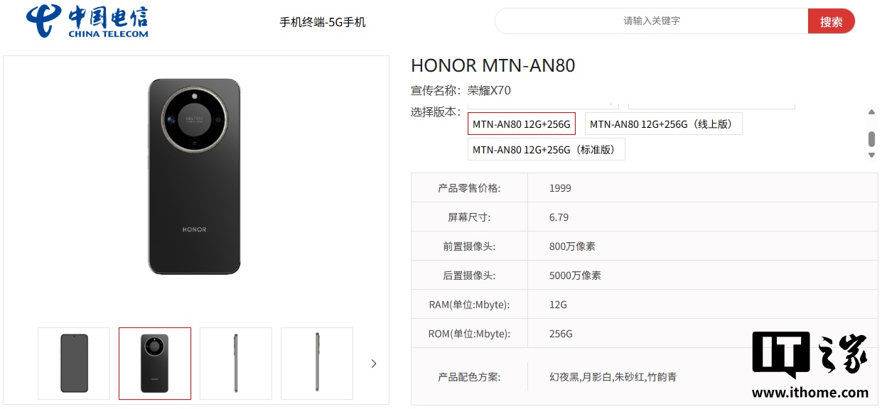 文章来源于互联网:荣耀 X70 手机现身中国电信终端产品库:第四代骁龙 6 移动平台、Android 15 系统,零售价 1999 元起