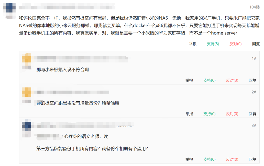 也有网友认为,Docker不重要,自己所需的是小米版华为云存储,只要能够将NAS做得像小米云服务一样,每天增量备份手机中的文件,他就愿意买单。