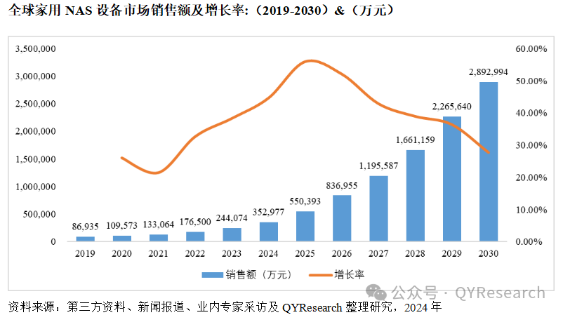 近几年随着流媒体、个人存储需求不断增加,NAS逐渐从企业、极客圈走向大众市场。市场调研机构恒州博智(QYResearch)统计数据显示,2023年全球家用NAS设备市场规模为24.4亿元,预计2030年将达到289.3亿元,年均复合增长率41.99%。