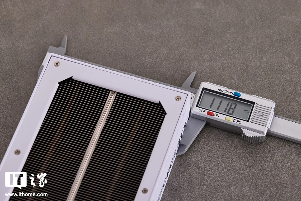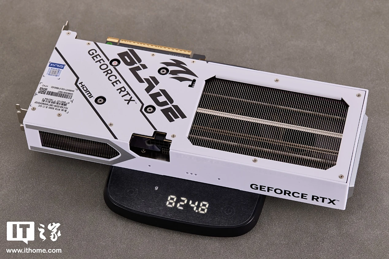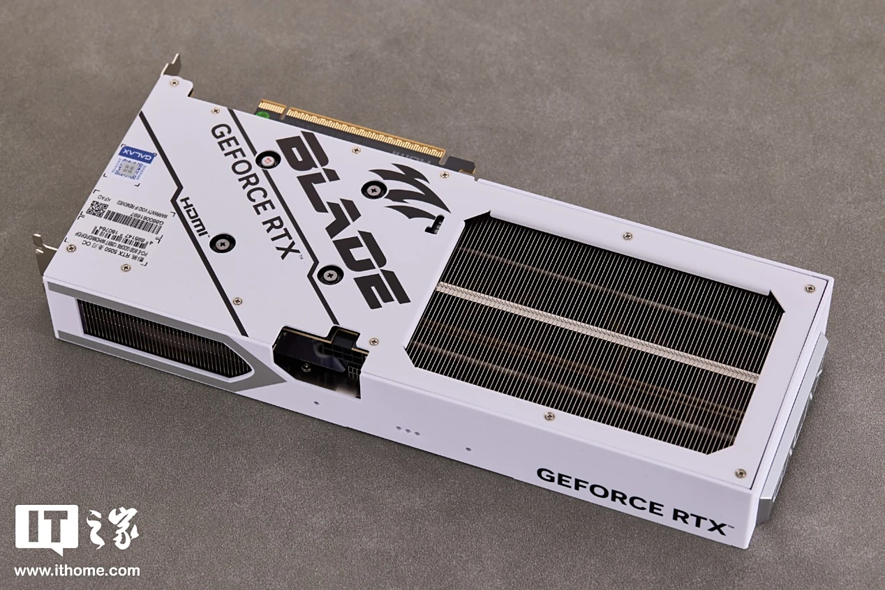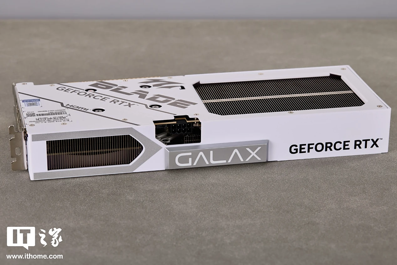 背板部分同样为纯白配色,左侧加入了一些斜向图案装饰和圣刃、GEFORCE RTX Logo,同时还印有指示 HDMI 接口位置的小标志,方便用户进行盲插操作。右侧是大面积的散热开口,露出内部排列规整的散热鳍片。