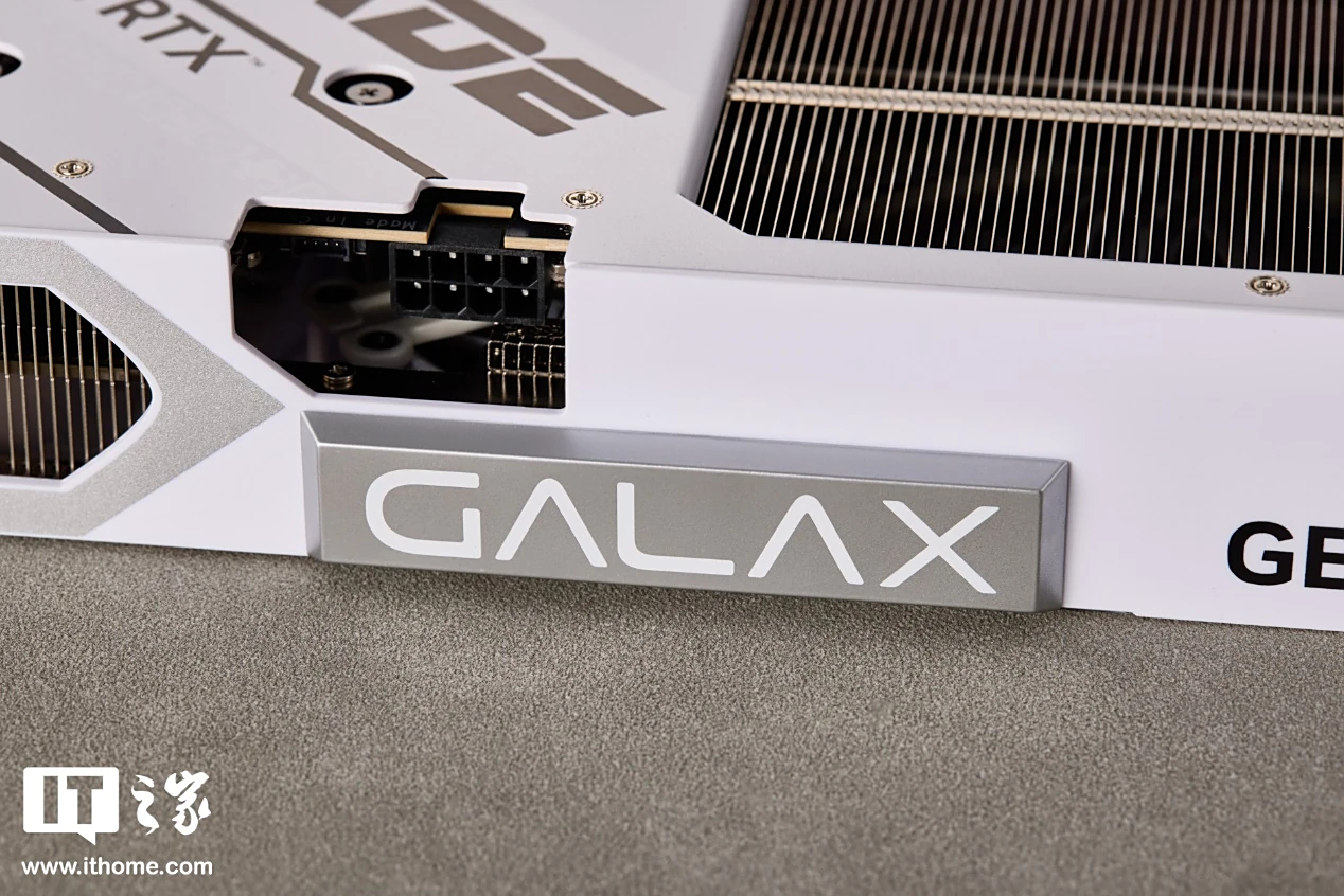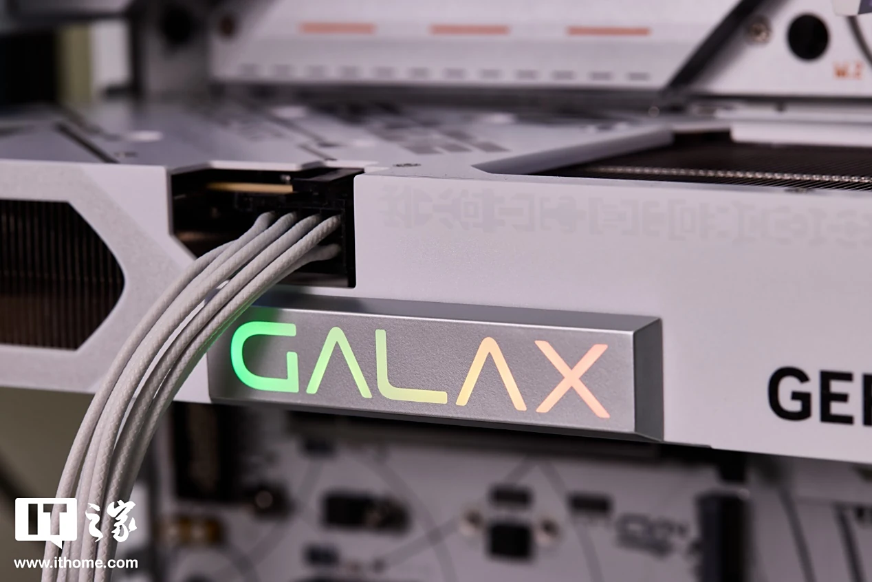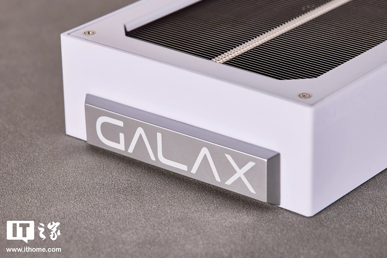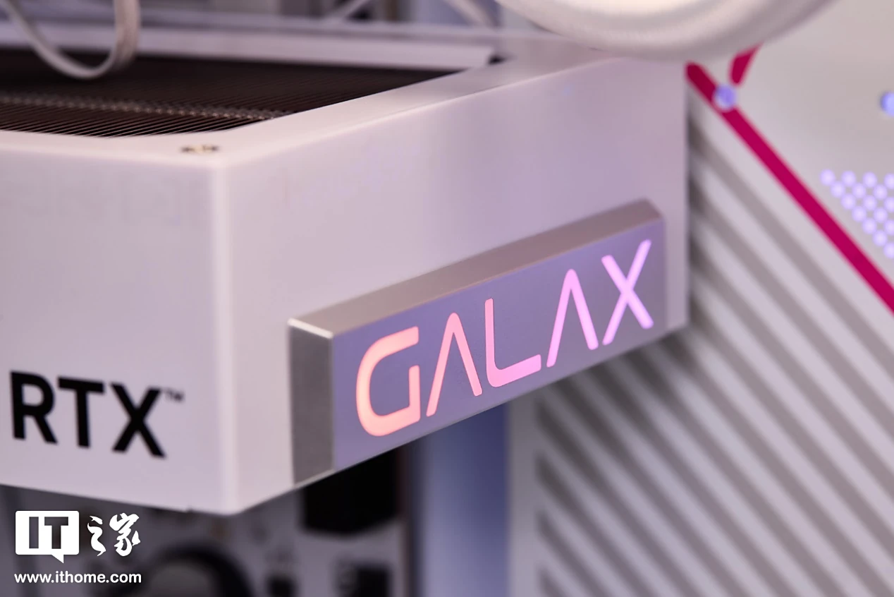显卡前侧的 GALAX Aurora 金属磁吸灯牌可拆卸下来吸附到右侧,非常灵活,搭配白色系海景房机箱可以带来氛围感更强的 RGB 灯效,算是设计上的一个小亮点。
