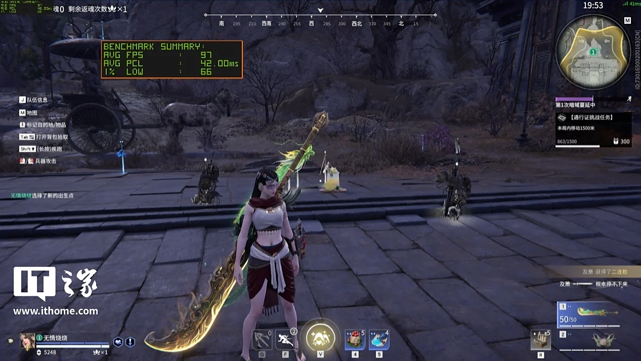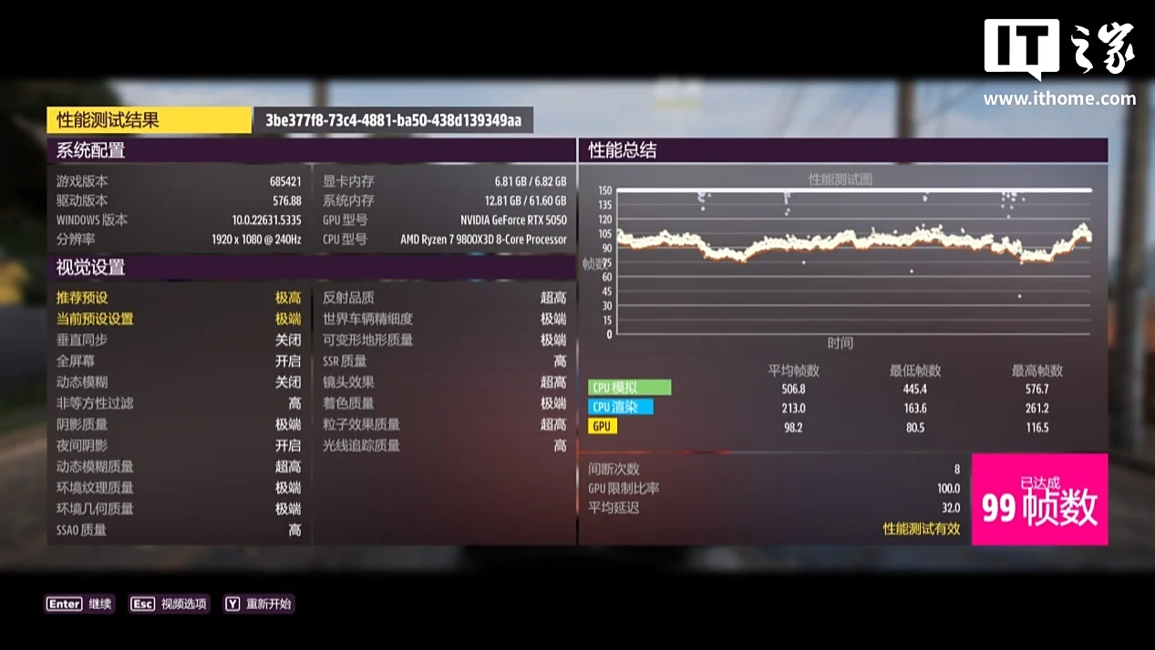 RTX 5050 在 1080P 分辨率 + 极端画质下,游戏平均帧数 98 帧,1% Low 帧 87 帧;