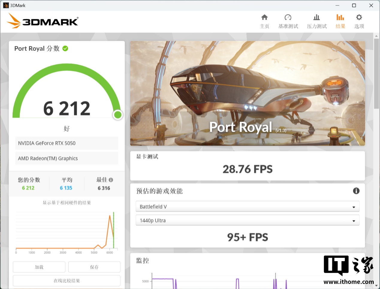 RTX 5050 的显卡分数为 6212 分;