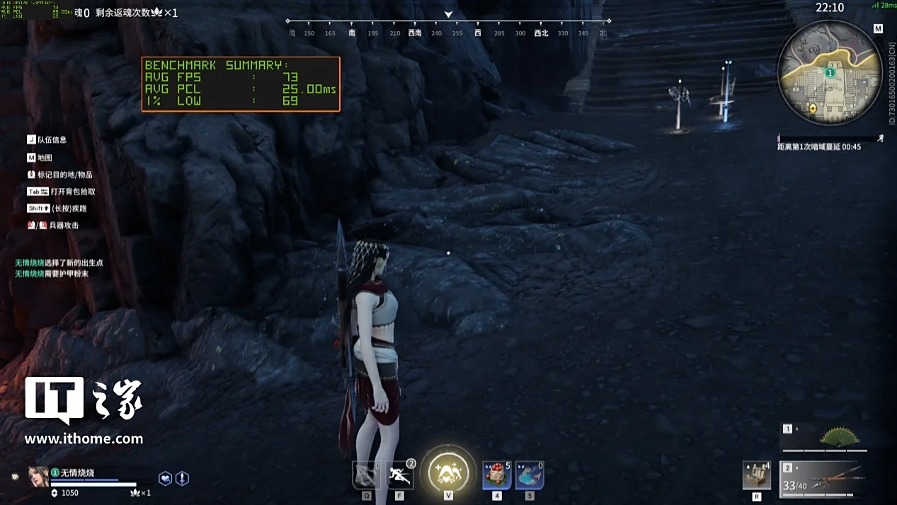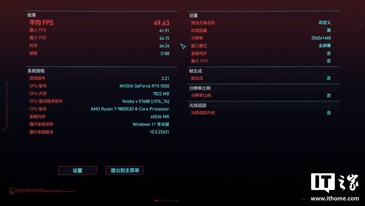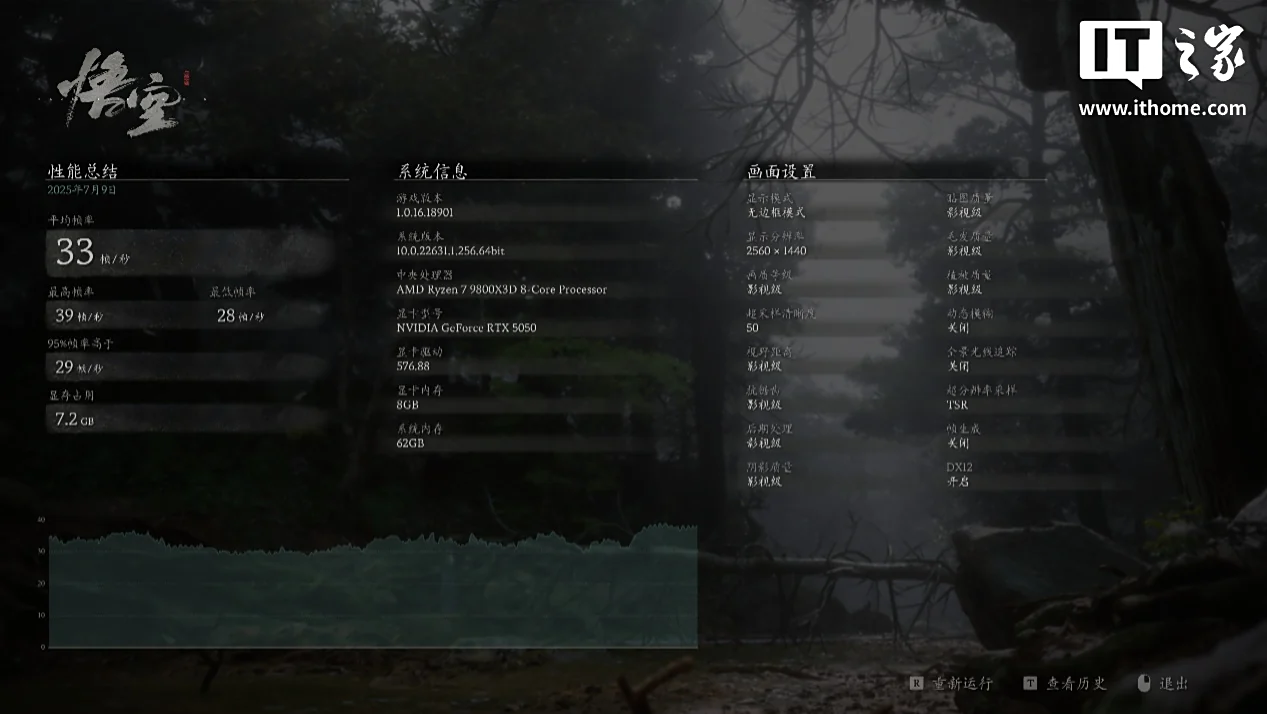 在 1080P 分辨率下关闭光追,使用影视级画质 + 50% 超采样分辨率 + TSR 运行游戏自带基准测试,游戏平均帧数只有 38 帧,2K 下更是只有 33 帧,看来使用原生画质但没有 DLSS 技术支持下,RTX 5050 想要流畅游玩这款游戏就必须适当降低部分画质选项。
