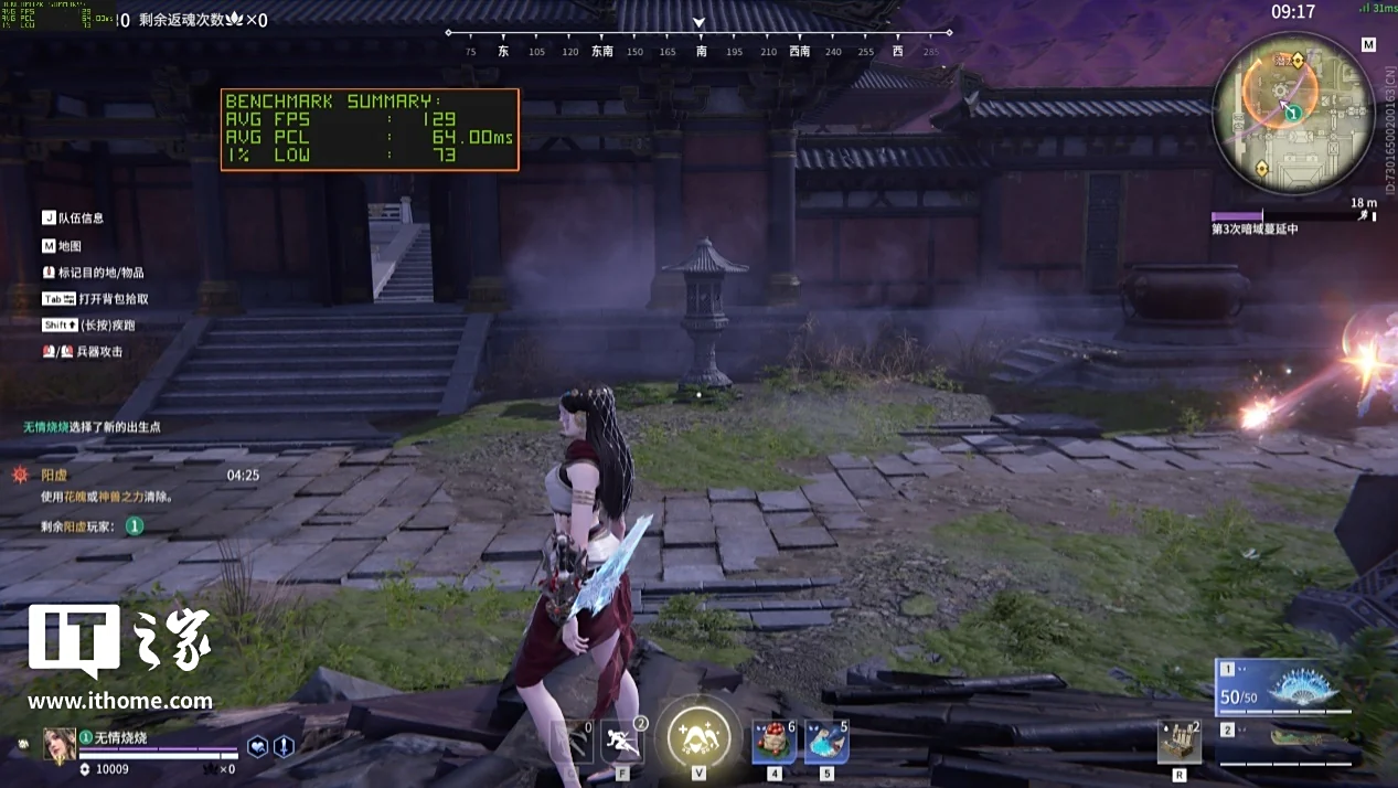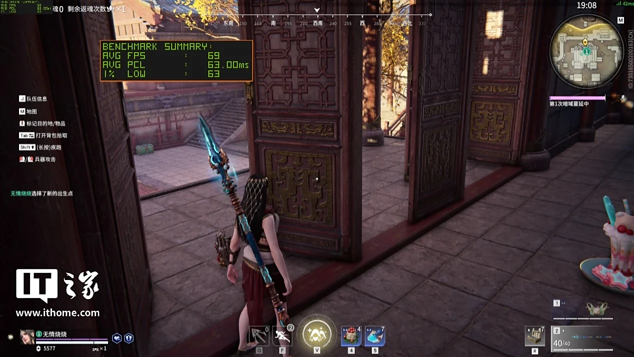 《永劫无间》是竞技网游中支持 DLSS 技术和 Reflex 低延迟技术比较及时的,因此可以通过这款游戏关注一下 DLSS 多帧生成下游戏帧数和 Reflex 低延迟的表现,首先在原生 2K 画质下,游戏平均帧数为 69 帧,不开启低延迟选项时游戏平均延迟为 63ms,开启低延迟选项后游戏平均延迟下降到 25ms,提升非常明显。