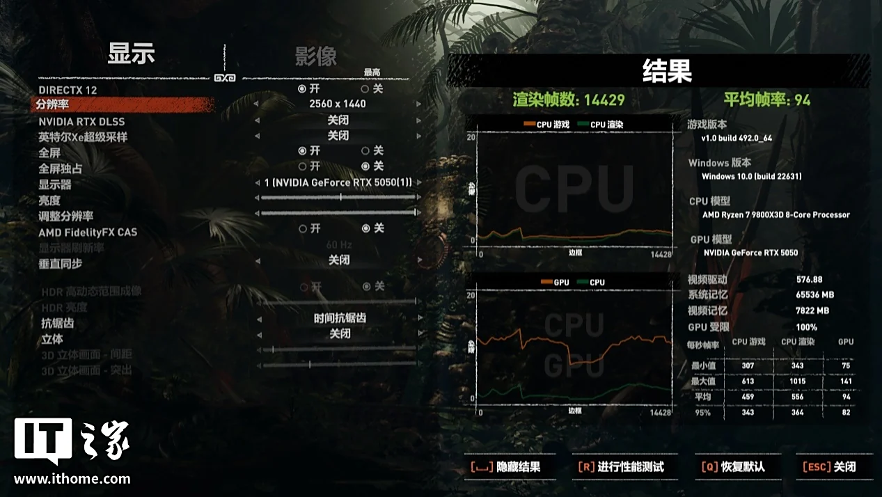 RTX 5050 在 2K 分辨率 + 最高画质下,游戏平均帧数 94 帧,1% Low 帧 75 帧;